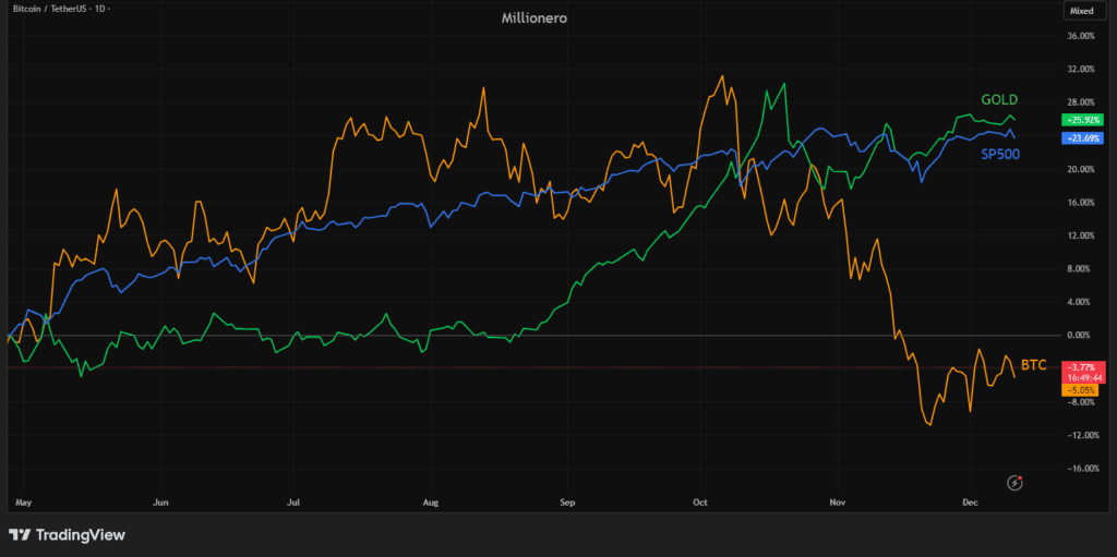 So far this year, Bitcoin has lagged other major assets: it is slightly negative year-to-date while the S&P 500 is up strongly and gold has surged more than 60%.