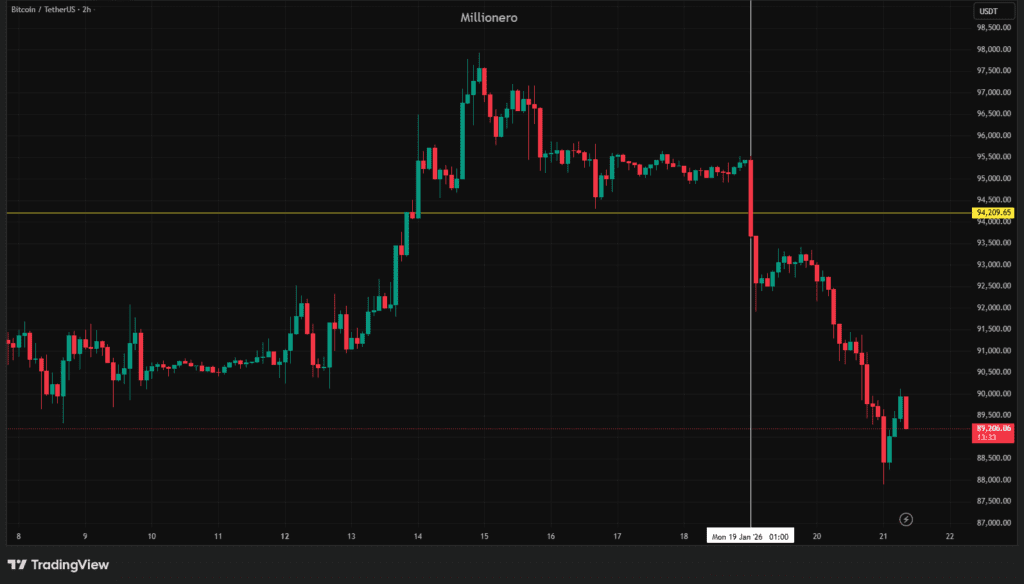 From Sunday evening (Jan 18, 2026) through today (Jan 21, 2026), crypto didn’t just “dip.” It slid, then fell faster, because the market was carrying too much leverage at the exact moment traditional markets got hit by a shock from Japan’s bond market.