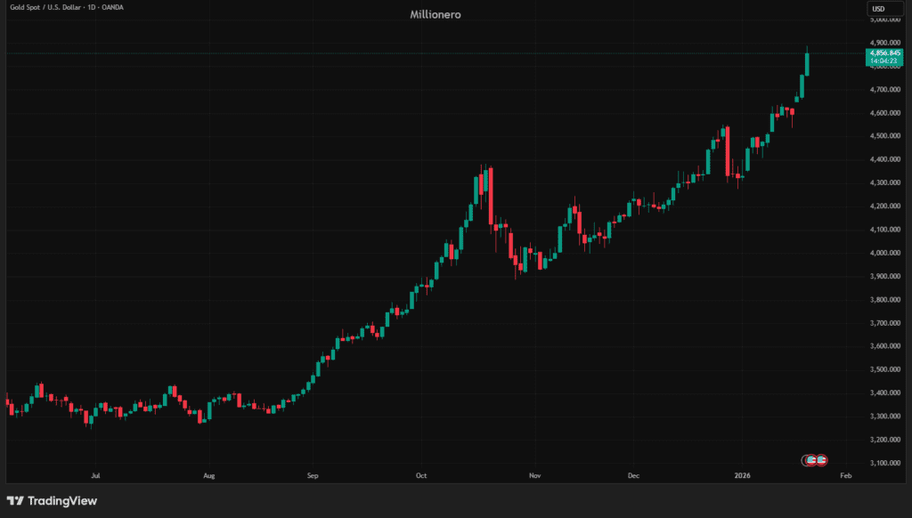 At the same time, the broader “fear trade” got loud. Gold surged above $4,800/oz for the first time on Jan 21, as investors rushed into traditional safe havens.