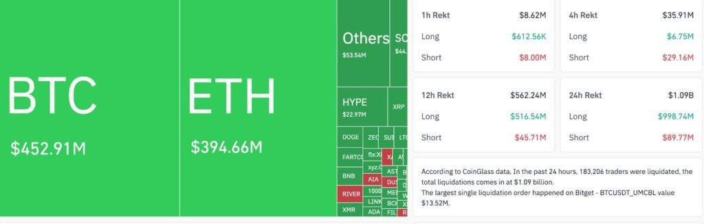 BTC pushed down toward $90K, and then broke lower. One widely-circulated read of the move was: BTC dropping to around $89,000 triggered about $1.09B in liquidations, with roughly 92% coming from long positions.