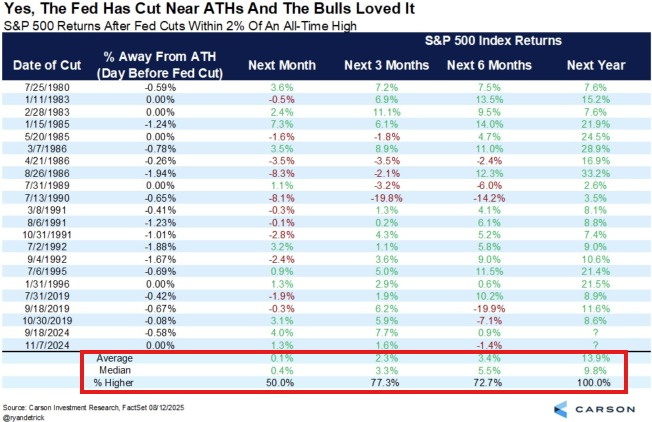 The S&P is at record highs while the Fed cuts. That’s happened a few times before, with average gains of 14% over the next year. But here’s the kicker: we’re not in a normal cycle. We’re in an everything bubble propped up by fiscal spending that makes 2020 look restrained.
