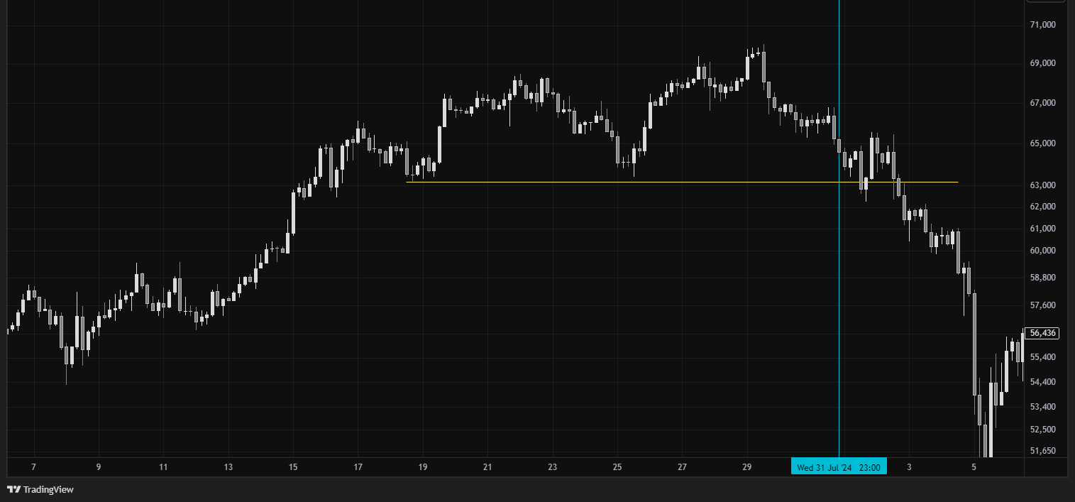 Real-world example – July 2024: Going into late July 2024, BTC and ETH had been rallying earlier in the month, but then stalled as the FOMC meeting approached. Just a few days before the July 31, 2024 Fed meeting, crypto markets suddenly sold off. This downturn mirrored weakness in equities, as investors grew cautious about the Fed and other macro data.