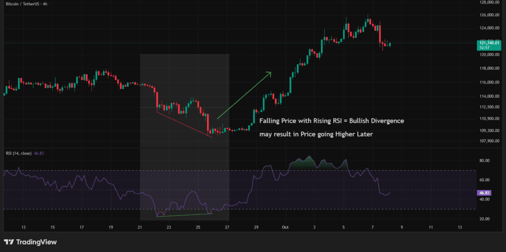 - BTC makes a new low, but RSI makes a higher low → this could mean selling pressure is fading. This is called Bullish Divergence.