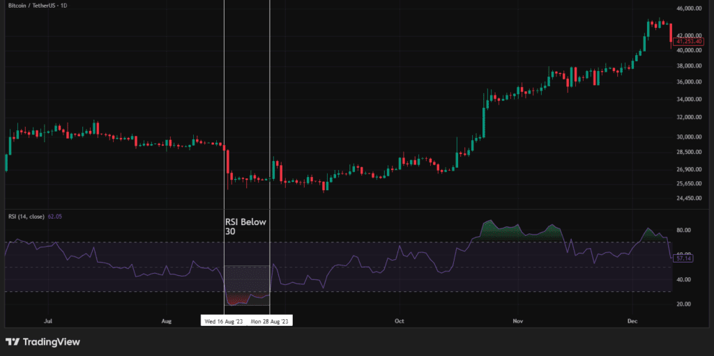 On the other side, if Bitcoin falls sharply from $29,000 to $26,000, the RSI might dip under 30. This suggests Bitcoin could be “too cheap” because many traders have sold off quickly, and buyers may soon step back in.