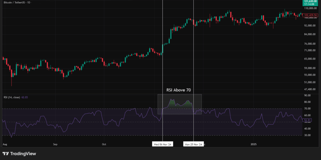 - Taking it as an automatic signal: Just because it hits 70 doesn’t mean Bitcoin must drop. In strong bull markets, BTC can stay above 70 for weeks.