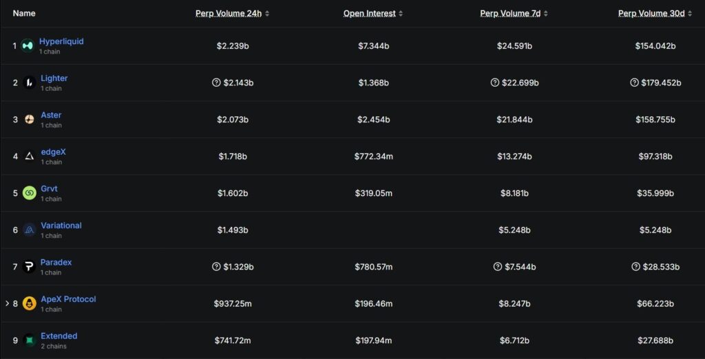 - Lighter – around $22.7B in weekly perp volume, with $1.36B in open interest.