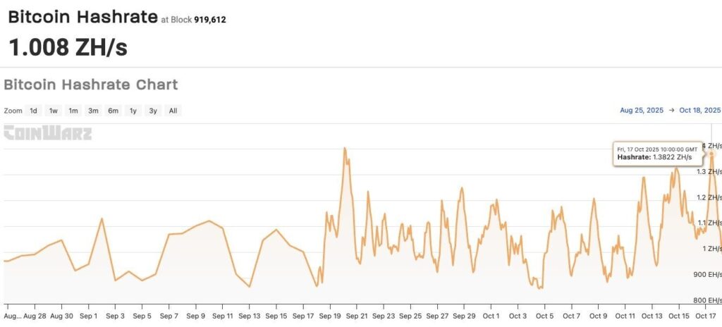 Bitcoin’s network strength also hit a historic milestone with a hashrate of 1,104.55 EH/s, the highest ever recorded. But the market side tells a different story.