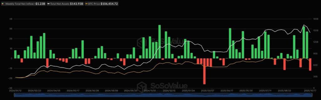For the first time since their January launch, spot Bitcoin ETFs posted a full week of net outflows. From October 13 to 17, funds saw $1.23 billion in redemptions, while Ethereum ETFs lost $312 million.