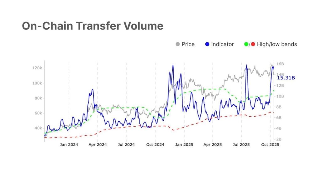 On-chain activity confirms that sentiment shift: total transfer volume jumped 2.9 % to $15.3 billion, up from $11 billion earlier in the month, showing renewed network engagement.