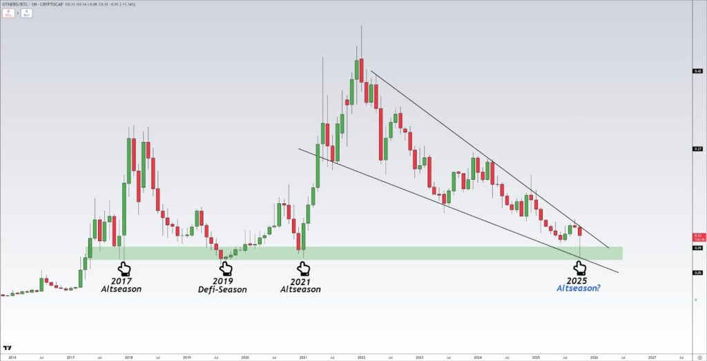Altcoins are sitting at rock-bottom levels against Bitcoin, forming a four-year falling wedge that mirrors the start of previous cycles: