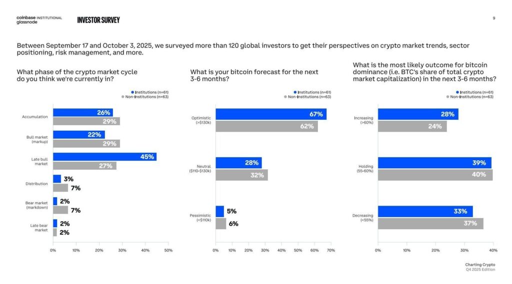 Yet despite the sell pressure, institutions remain long-term bullish. A joint Coinbase-Glassnode survey of 120 funds found 67 % expect Bitcoin to trade above $130 K within six months. Only 2 % believe the market is in a bear phase. Professional money still sees upside, even if short-term volatility rises.