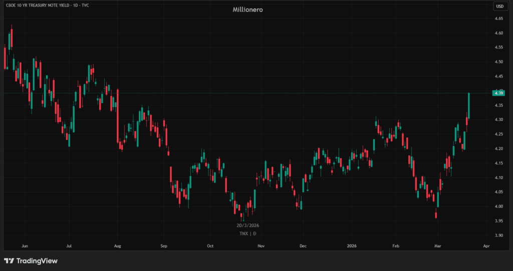 One of the most important points going into this week is that oil may no longer be the only market to watch. The 10-year US Treasury yield has risen about 45 basis points since the war began on February 28, reaching 4.40%. The argument being made is simple: if the 10-year pushes back into the 4.50% to 4.60% area, that could become the real pressure point for policy and markets, just like it did during the tariff stress in April 2025.