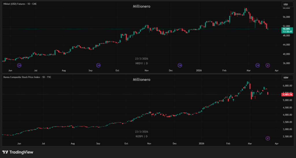 Asian markets reflected how serious the energy angle had become. Japan’s stock market (Nikkei) fell more than 4% on the day, and South Korea’s fell more than 6%, both linked to the worsening energy crisis. These moves matter because they show this is no longer only a US-Iran headline. It is now feeding directly into regional equity stress in Asia.