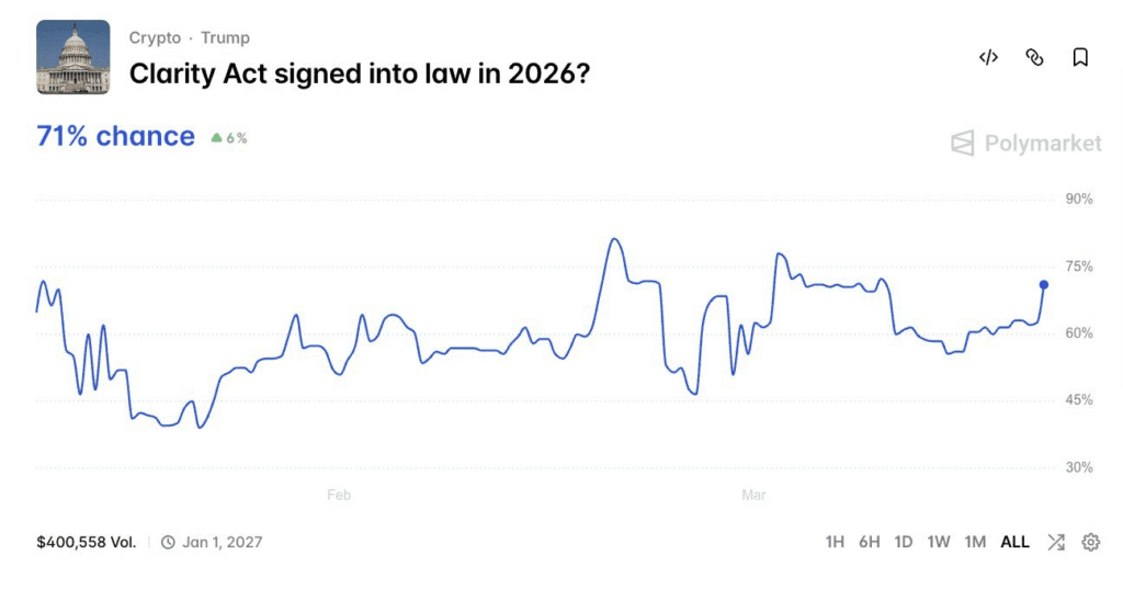 There was also a legal and policy angle. Polymarket traders pushed the probability of the Clarity Act being signed in 2026 up to 71%. That does not directly move prices today, but it shows that part of the market is still looking beyond the war headlines and toward a friendlier US crypto policy environment later this year.
