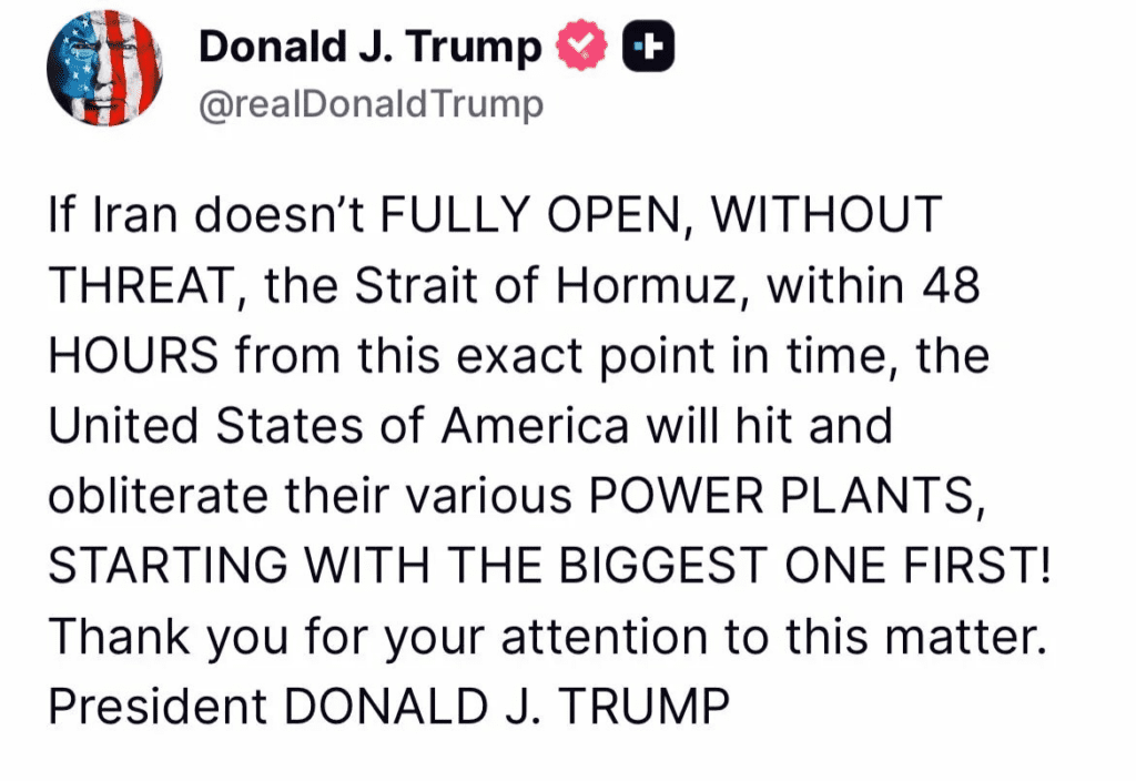 The weekend was dominated by a sharp rise in geopolitical risk. The biggest trigger was President Trump’s 48-hour deadline for Iran to fully reopen the Strait of Hormuz without threat, with a warning that the United States would otherwise begin striking Iranian power stations, starting with the largest ones. That message quickly changed the mood across markets because Hormuz is not just another waterway. It is one of the most important oil routes in the world, so any threat around it immediately hits oil, equities, bonds, and crypto at the same time. The reaction was not only financial. There was also growing concern about the humanitarian side of the escalation, especially after warnings that attacks on power infrastructure could leave millions without electricity.