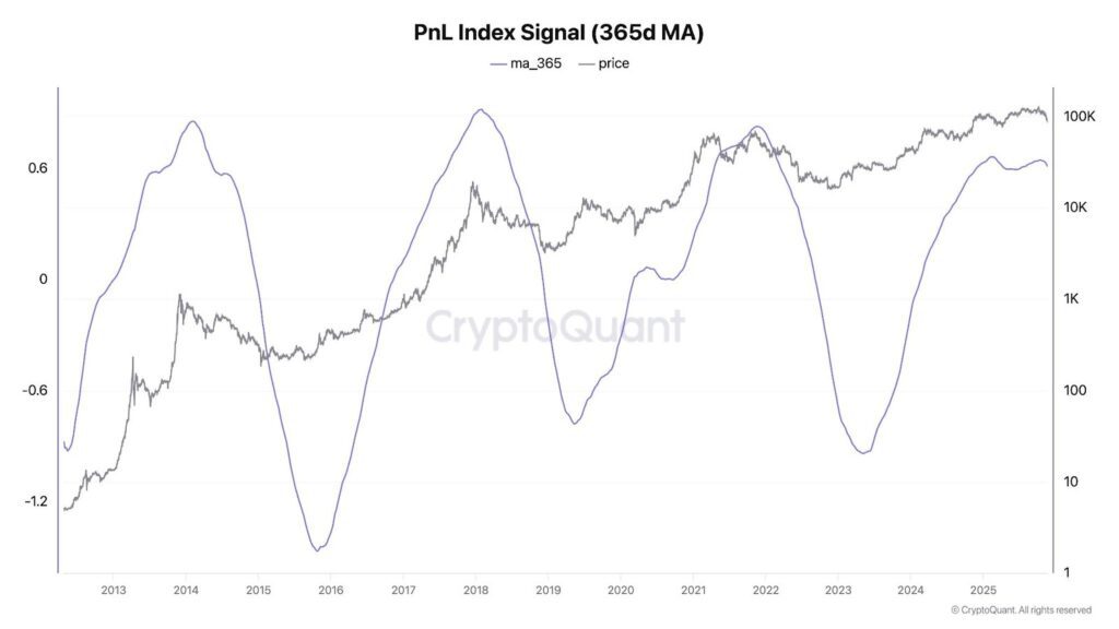 According to @ki_young_ju’s PnL Index, which measures profits and losses based on the average cost basis of all wallets, Bitcoin is now in a clear profit-taking phase. In classic cycle theory, that often marks the transition into a bear market, where investors close winning positions as momentum slows down. The one factor that can still flip this pattern is liquidity. We saw this in 2020, when massive global stimulus overpowered negative signals and sent Bitcoin much higher despite “late-cycle” warnings.