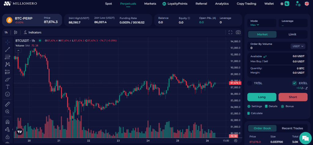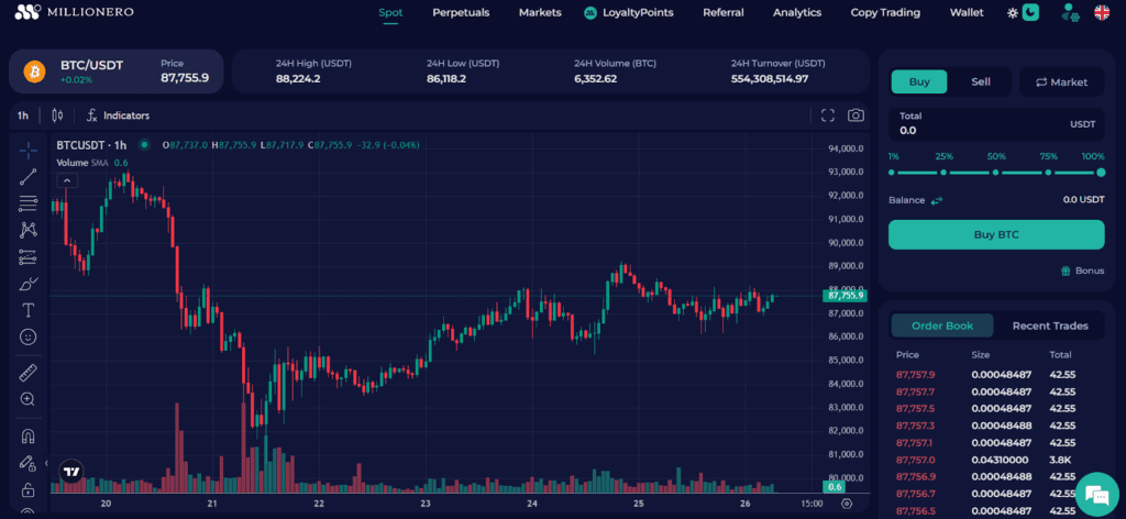 Millionero’s exchange is built for beginners. The Spot and Perpetual markets are accessible from one account with a clear interface. The Spot page is very user-friendly.Millionero even calls it their “simplest and easiest” interface, with buy/sell fields preset to avoid confusion. A new trader can go to BTC/USDT (spot), enter an amount, and trade without hassle.