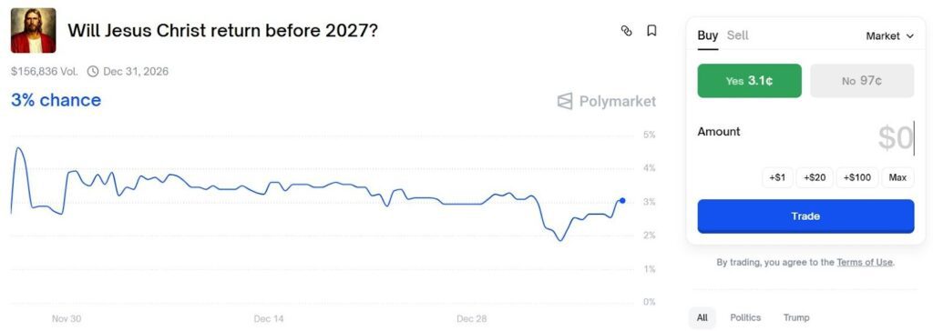 The now-famous market on “Will Jesus Christ return to Earth?” In 2025 drew about $3.3 million in bets, and “Yes” odds didn’t go to zero. That kept “No” priced around $0.97, letting rational traders earn a steady return by taking the “safe” side.