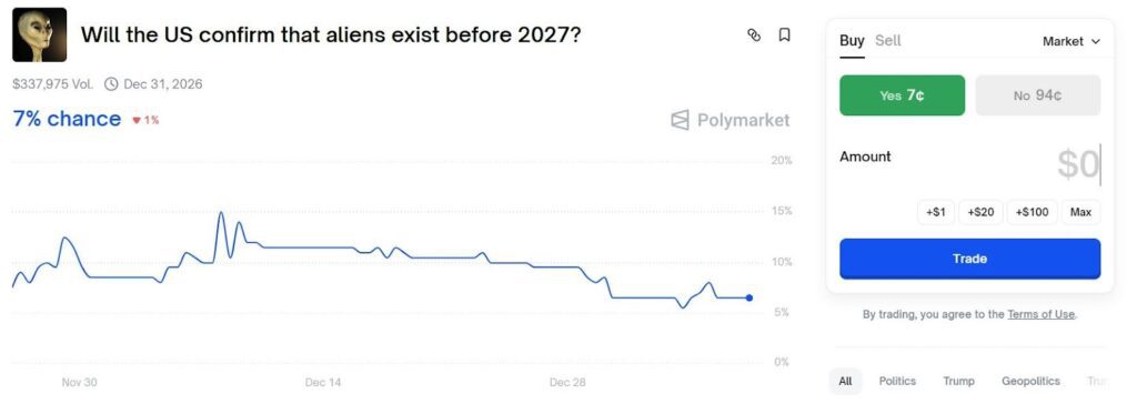 The same logic shows up in other long-shot markets, aliens, civil war, the EU dissolving, where “No” becomes a kind of high-yield bond with tail risk.