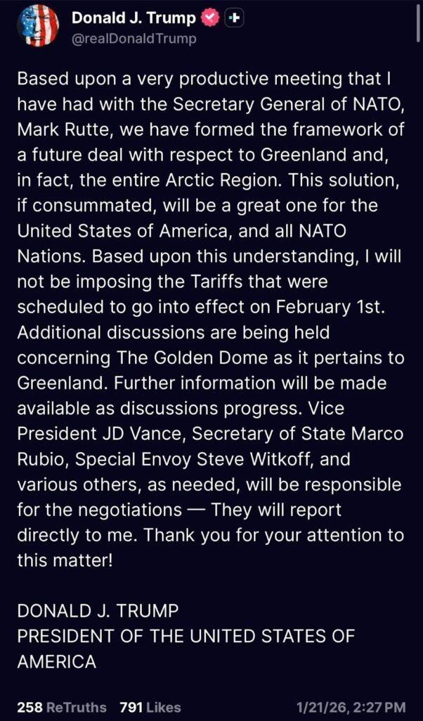 Then came the second message: Trump said he had a “very productive meeting” with NATO Secretary General Mark Rutte, and claimed they had formed the framework for a future deal involving Greenland and, more broadly, the Arctic region.