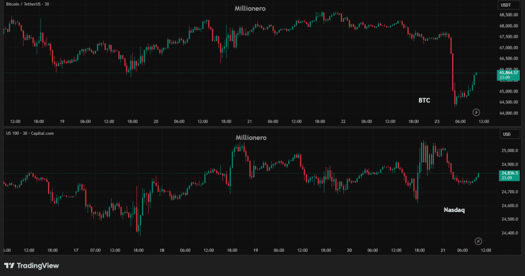 And like so many of Trump’s market-moving decisions, this one dropped on a weekend, when stock markets are closed and crypto, the market that never sleeps, absorbs the full brunt of the shock alone. By early Monday morning, Bitcoin had fallen below $65,000, shedding $2,500 in just 60 minutes and liquidating $240 million worth of leveraged long positions in the process. Nasdaq 100 futures extended losses to nearly -1%. US stock market futures opened lower across the board. The crypto market, which has already been under pressure from weeks of uncertainty and deleveraging, once again found itself as the first casualty of a macro event it had no say in.