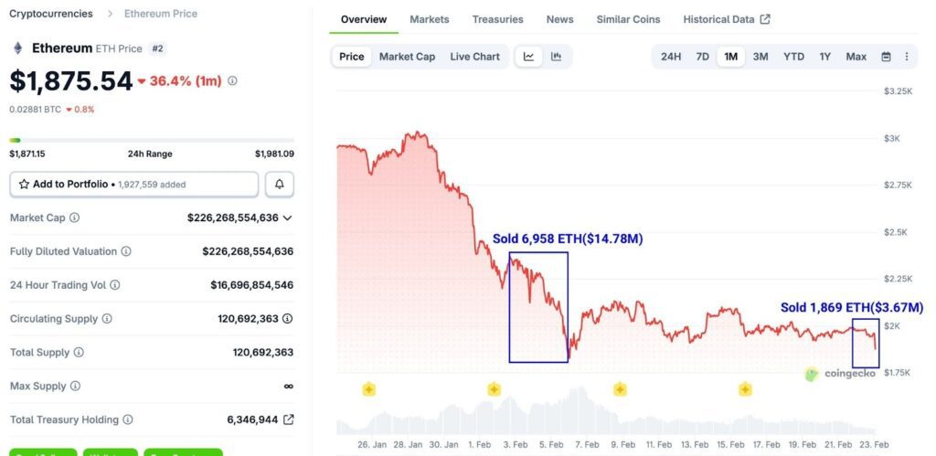 On the crypto-specific front, Vitalik Buterin has been selling ETH again, and the market is paying attention. Over the past two days, he sold 1,869 ETH worth approximately $3.67 million. During that same window, ETH fell from $1,988 to $1,875, a drop of about 5.7%. For context, the last time he sold, 6,958 ETH worth around $14.78 million, ETH dropped from $2,360 all the way to $1,825, a 22.7% decline.