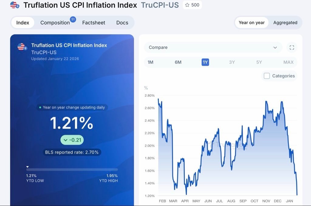 On inflation, another narrative showed up: Truflation was cited around 1.2%, and the argument was that deflation risk may now be bigger than inflation risk, pushing the idea that the Fed should cut aggressively. Whether or not that call is right, the point is that the market is already fighting about the next regime: “Do we get cuts because growth slows, or do we stay tight because politics and supply shocks keep pressure alive?”
