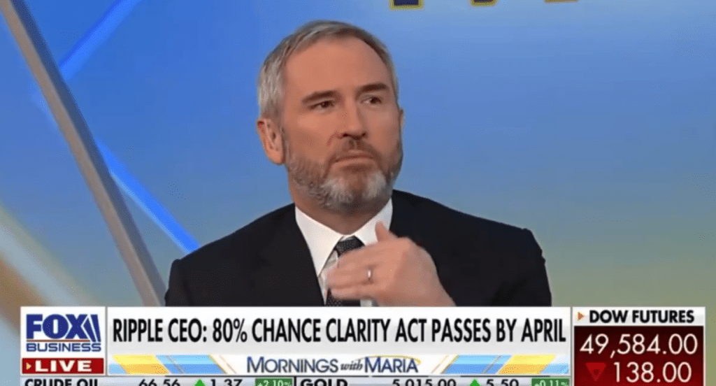 Estimates of CLARITY passing jumped this week from 60% to 90%, according to some observers. Ripple CEO Brad Garlinghouse echoed that optimism, saying he sees a 90% chance a market-structure bill passes by end of April, and that meetings between crypto leaders and the banking sector in Washington are intense right now.