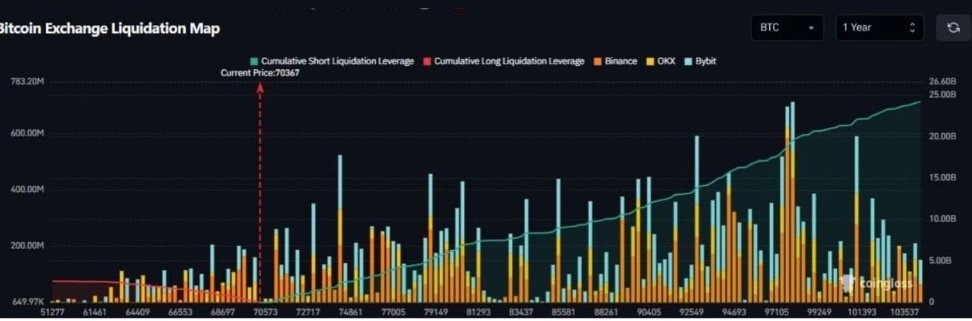 On the derivatives side, a 10% move up in Bitcoin could trigger roughly $4.34 billion in short liquidations, while a 10% move down would trigger about $2.35 billion in long liquidations. The imbalance suggests the short side is more crowded or more leveraged, meaning an upside surprise could be more violent than a downside move.