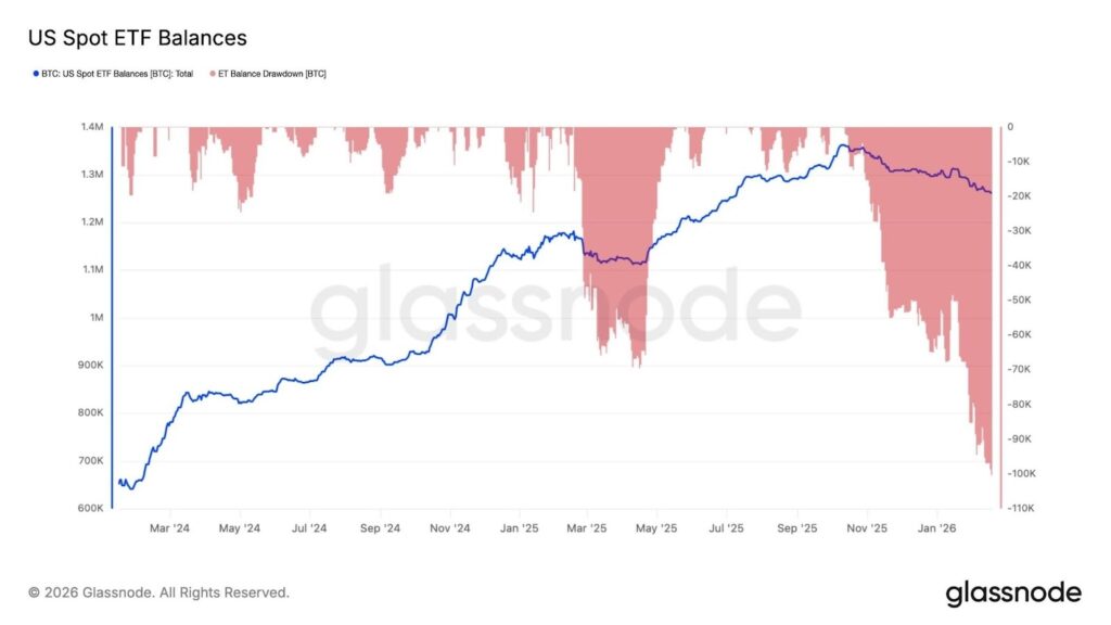 U.S. spot Bitcoin ETFs saw a drop of roughly 100,300 BTC from holdings, the biggest pullback since the October 2024 peak. Glassnode described the broader picture as the largest crypto outflows since 2022, with both Bitcoin and Ethereum positions shrinking. Stablecoin growth also nearly flatlined, which matters because stablecoin growth is usually a sign of fresh money entering the ecosystem. When that stops, prices become more sensitive to any shock.