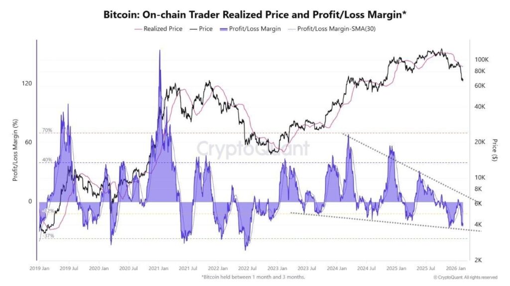 Short-term Bitcoin holders (people who bought in the last one to three months) are sitting on an average unrealized loss of about -20%. Historically, that level tends to show up near local bottoms, not cycle tops, because it reflects panic among newer buyers whose resolve cracks first.