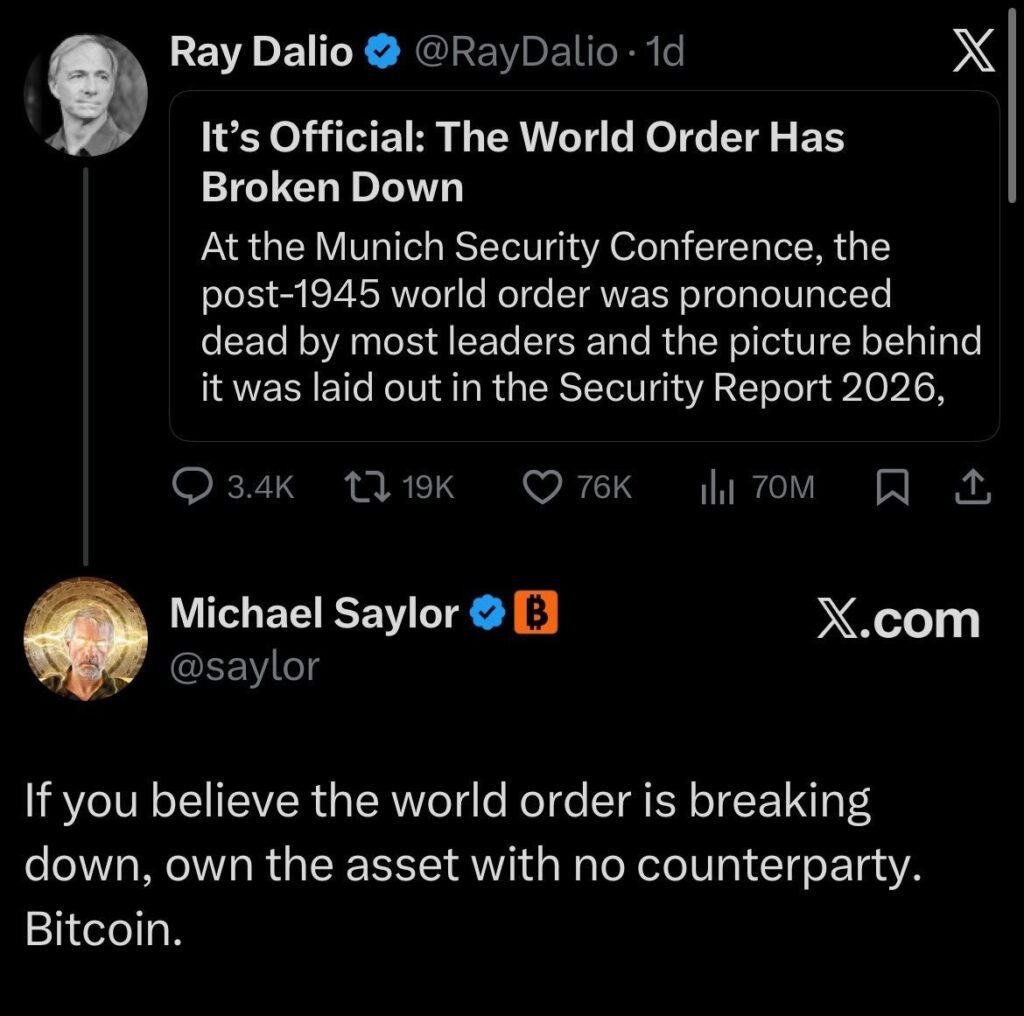 Michael Saylor also went on record telling Ray Dalio that if you believe the global financial system is breaking down, Bitcoin, as an asset with no counterparty, is the logical safe haven.
