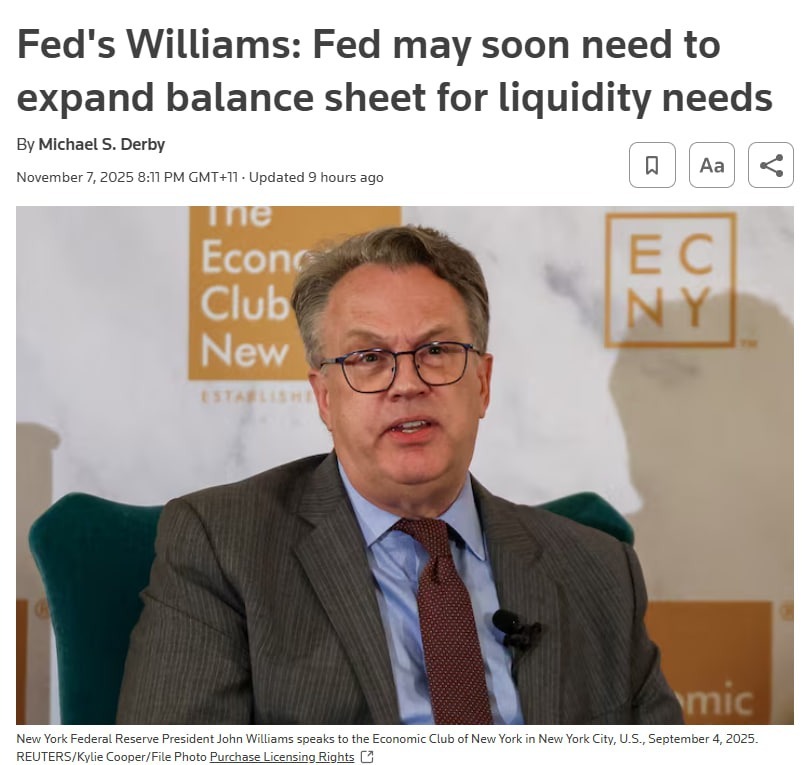 - John Williams, head of the New York Federal Reserve, signaled that the Fed may start expanding its balance sheet soon. Markets see this as a very strong hint of more liquidity and maybe a return to something like quantitative easing.