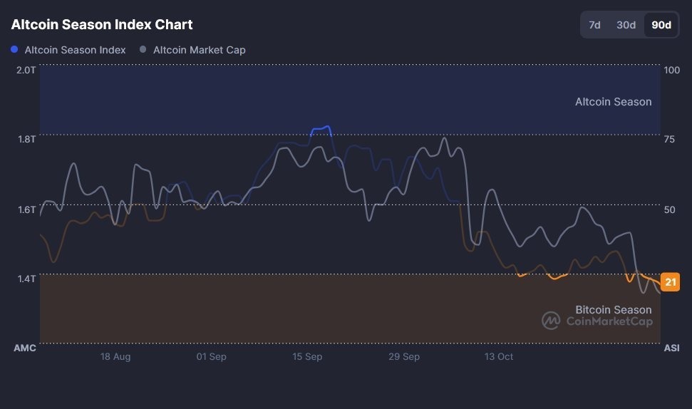 - The Altcoin Season Index from CoinMarketCap dropped to 21, officially marking a “Bitcoin season” where BTC outperforms most altcoins in price and liquidity.