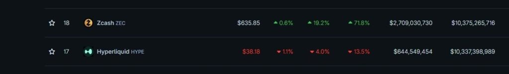 It’s noted that ZEC jumped ahead of HYPE (HYPE) in total market cap, reflecting rising demand and trust in this older privacy project.