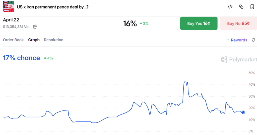 Hopes for a permanent US-Iran peace deal by Wednesday, April 22 have dropped sharply. Polymarket odds for a deal fell to about 19.5% yes, and analysts are now warning that failure could trigger “war phase 2.”