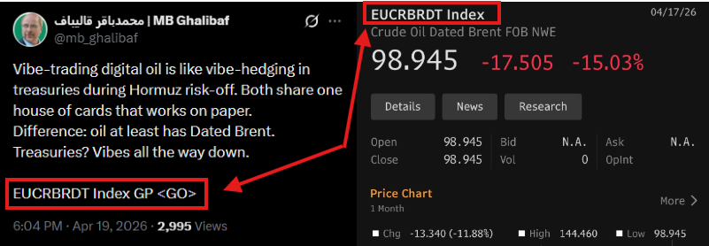 One of the strangest weekend developments came from Ghalibaf’s market language. He commented on “vibe-trading” digital crude oil prices and US Treasuries and ended with the Bloomberg Terminal command “EUCRBRDT Index GP ”, which is the command for Dated Brent oil prices.