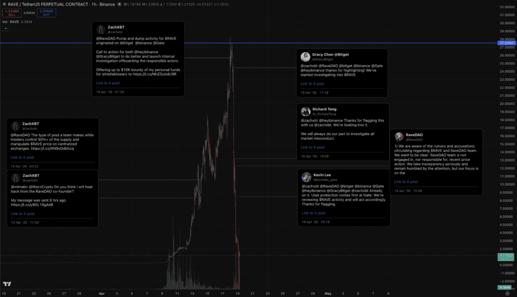 On April 18 at 07:26 UTC, on-chain investigator ZackXBT publicly accused insiders controlling more than 90% of supply of running a coordinated pump-and-dump. He named the exchanges involved, called on Binance and Bitget to investigate, and offered a $10,000 bounty, later raised to $25,000, for strong whistleblower evidence.