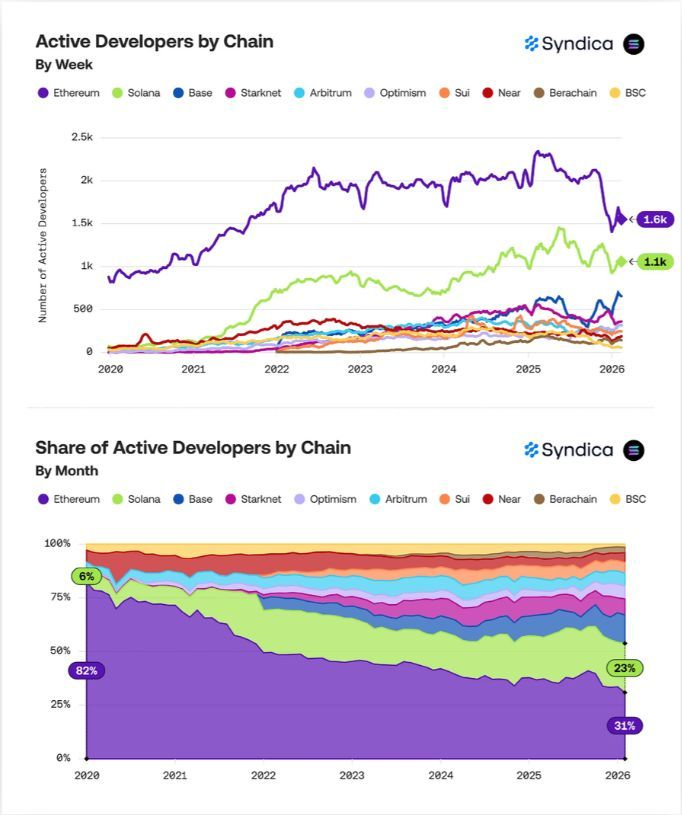 Developer activity data showed a clear shift between Ethereum and Solana. Solana’s share moved from 6% to 23%, while Ethereum’s share moved from 82% to 31%, according to Syndica.