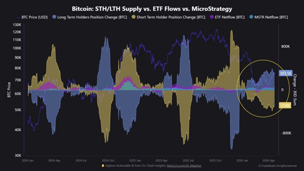 That ETF demand came alongside other signs that Bitcoin supply was moving into stronger hands. Long-term holders accumulated around 303,000 Bitcoin over a 30-day period, while short-term holders sold about 290,000 Bitcoin. Strategy alone bought around 53,000 Bitcoin during that same supply shift. The result was a visible transfer of supply from weaker hands to longer-term holders.