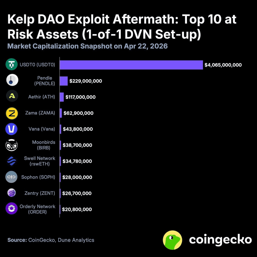 Security stayed a major theme after the Kelp DAO hack. More than $4.5 billion was still exposed to the same hack vulnerability. About 47% of LayerZero applications, or OApps, were still running on a 1-of-1 DVN setup, according to CoinGecko. The material described that model as security-weak and hackable.