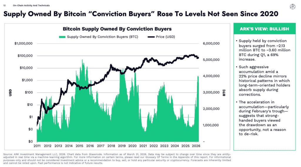 ARK Invest Foundation reported that Bitcoin held by “conviction investors” rose by 69% in the first quarter. Their holdings moved from 2.13 million BTC to 3.60 million BTC, the highest level since 2020. This happened even though Bitcoin’s price fell by about 22% during the same period.