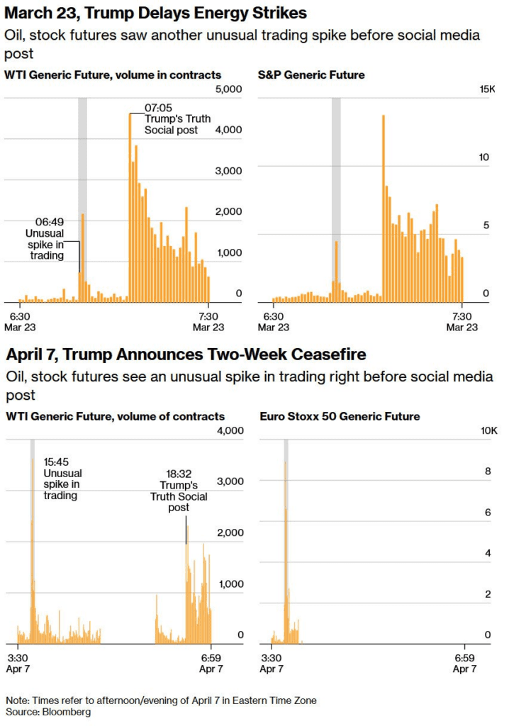 At the same time, suspicions of insider trading hit the oil market. Oil trades worth $1.7 billion were executed within two minutes, about three hours before the ceasefire announcement. Another $2 billion in oil trades was executed within two minutes, about 16 minutes before a post about the strike postponement.