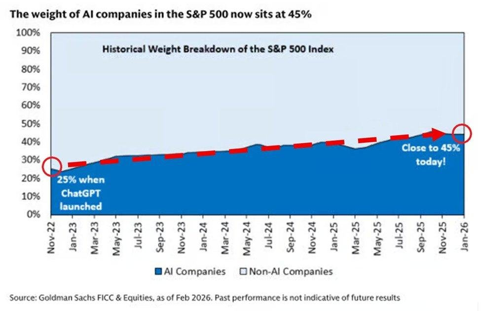 About 45% of S&P 500 companies are now tied to AI. In performance, Anthropic was described as leading, followed by xAI, Google, and OpenAI, with DeepSeek and Alibaba closing in.