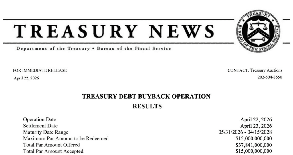 The U.S. Treasury Department executed the largest buyback operation in its history. It repurchased $15 billion of government bonds, or Treasuries. This was described as the largest recorded buyback operation to date.