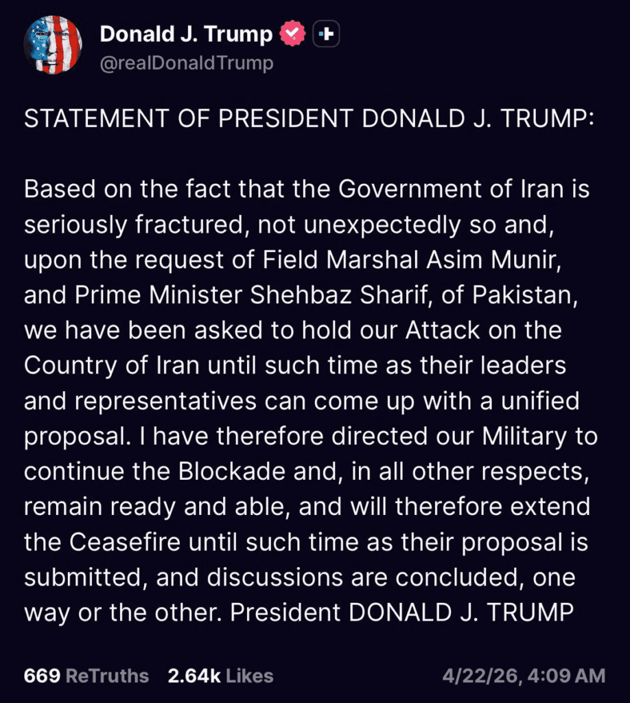 The ceasefire between America and Iran was extended indefinitely. The decision came after a request from Pakistan to give more time for negotiations and to try to reach a final agreement, according to Reuters. Markets began to show some relief as fear eased around the deadline expiring and escalation increasing.