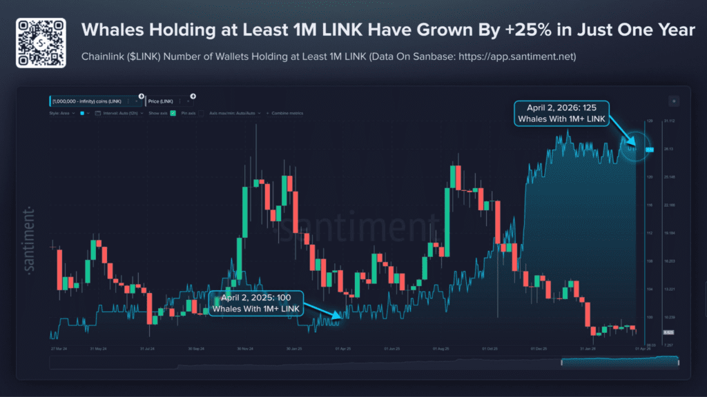 Another important on-chain signal appeared in Chainlink. In April 2025, there were 100 wallets holding 1 million LINK or more. By April 2026, that number had risen to 125 wallets. That is a 25% increase in one year.