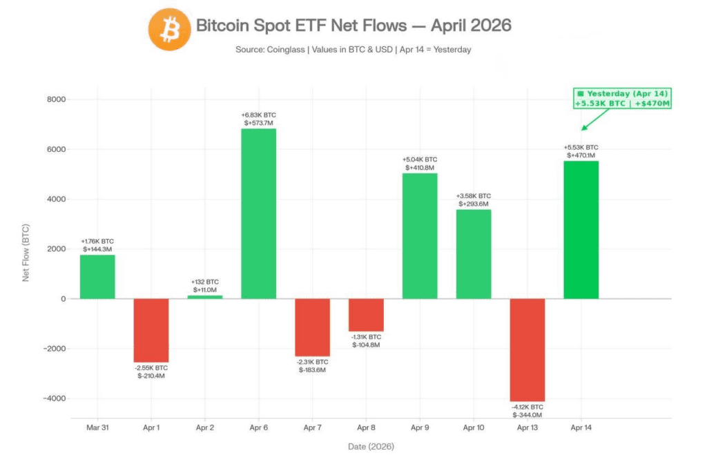 Bitcoin ETF funds bought about 5,530 BTC worth $471 million in a single day. In that same stretch, IBIT bought 2,870 BTC, extending its buying streak to five straight days. Over those five days, BlackRock accumulated 9,631 BTC.
