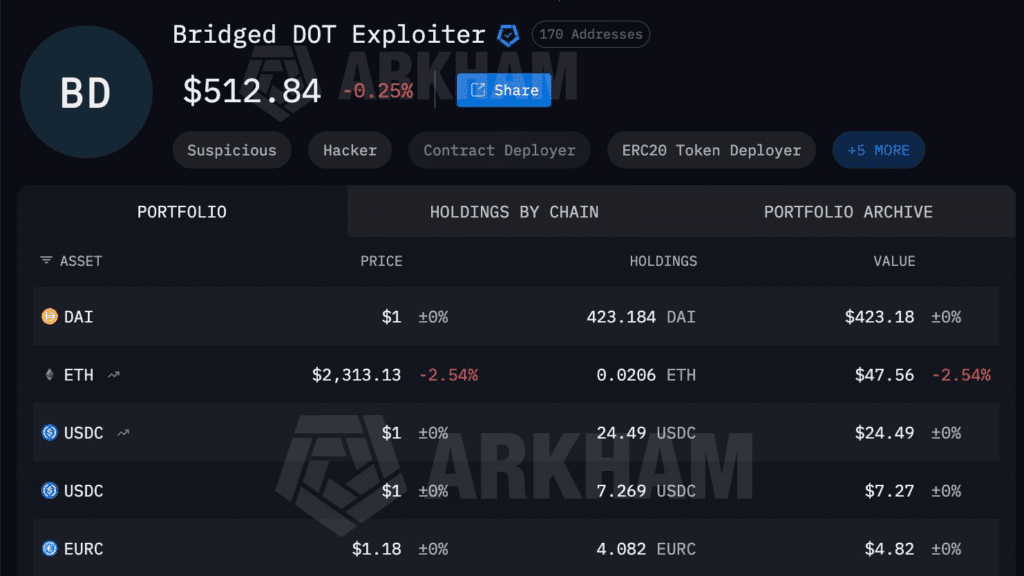 Security incidents stayed part of the market picture. The attacker tied to the Polkadot incident moved all stolen funds to Tornado Cash in an effort to hide the trail. The reported amount was about $269,000, according to Arkham.