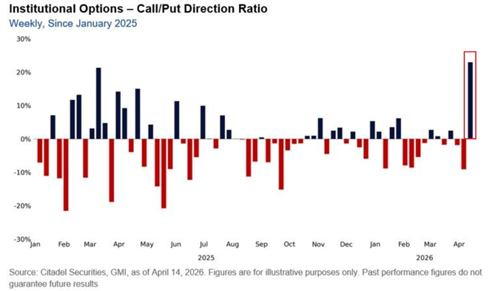 The move in stocks was backed by heavy institutional positioning. According to Citadel, institutional investors bought about 22% more call options than put options last week, the largest difference in at least 16 months.